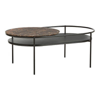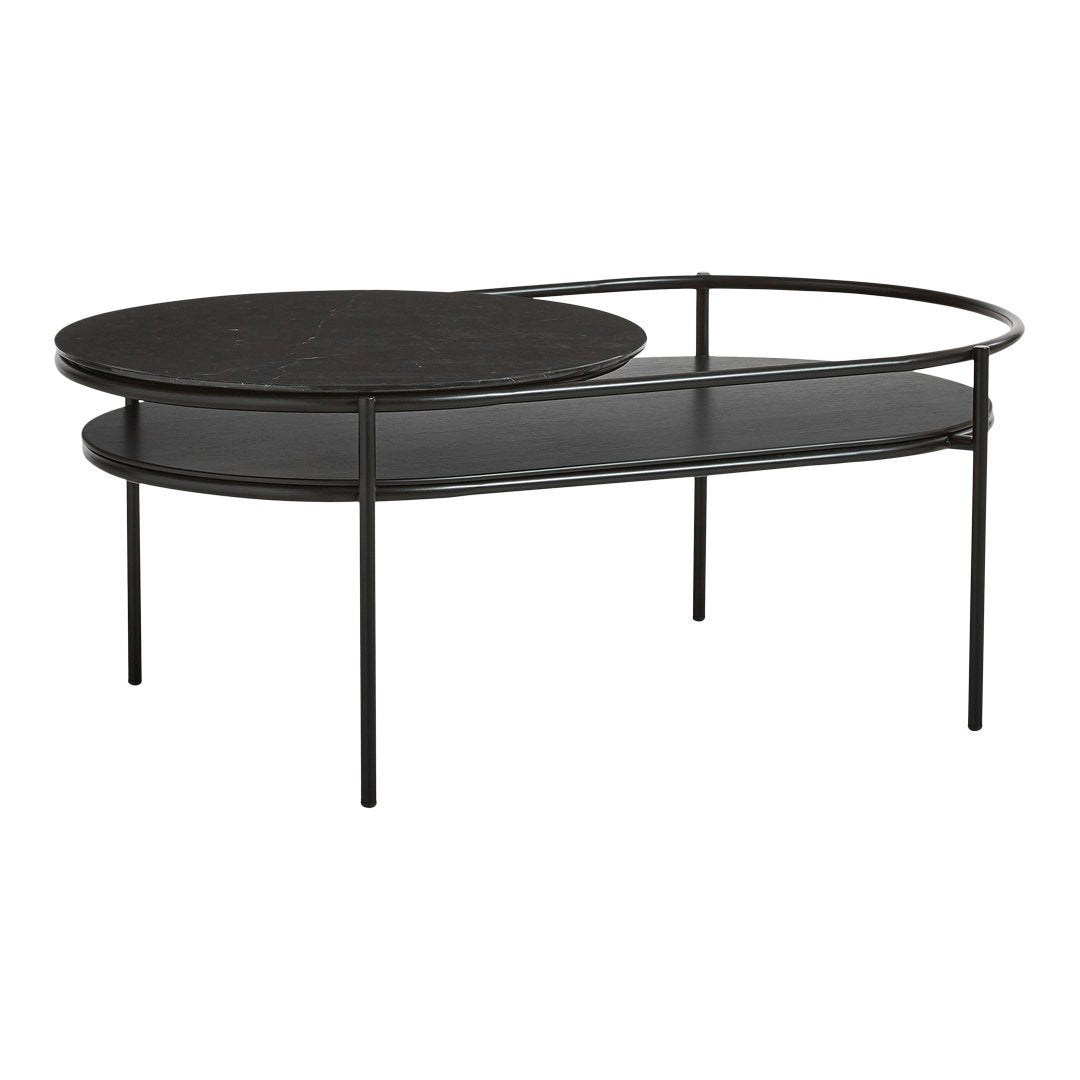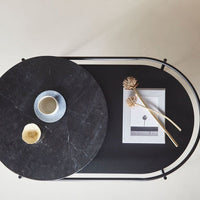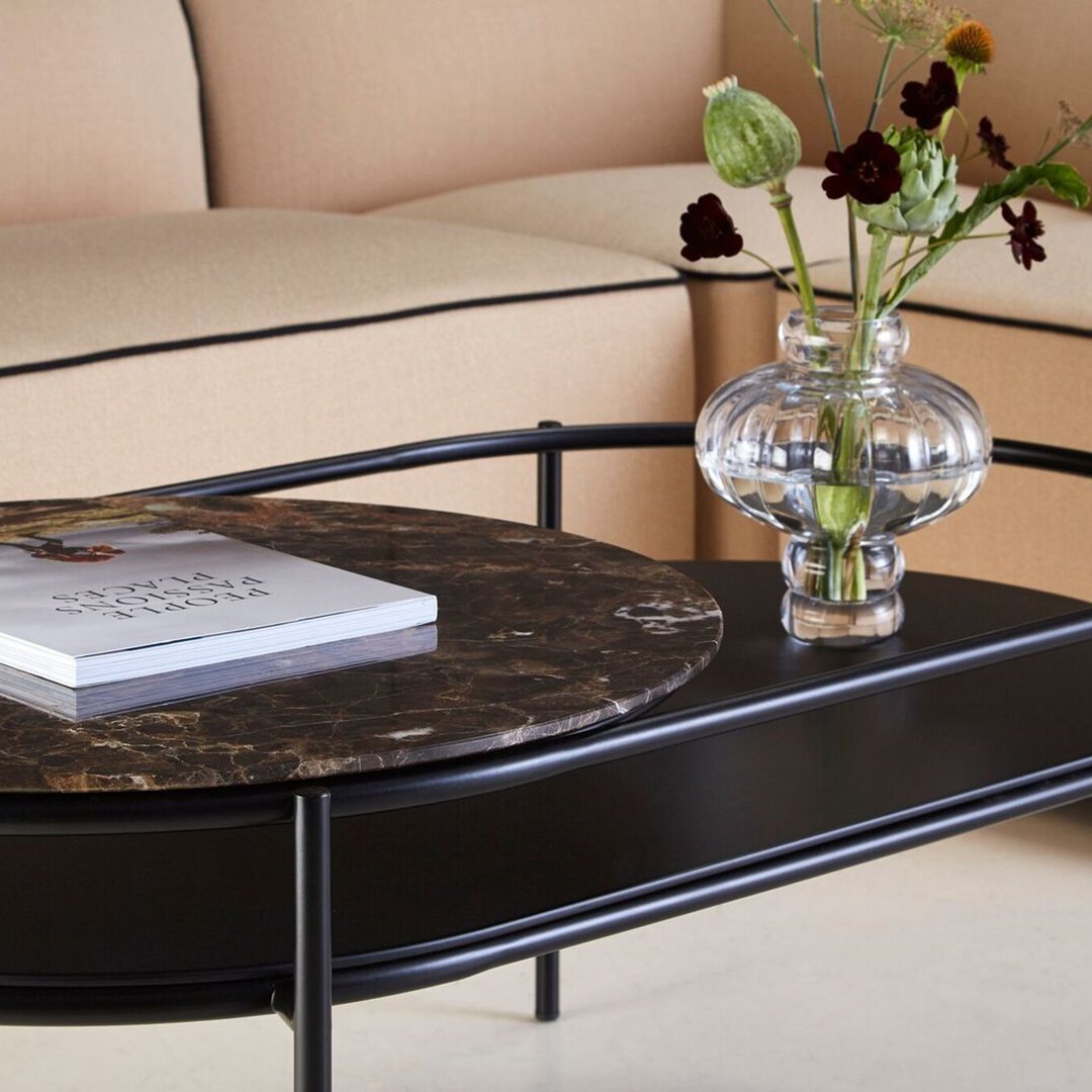 The elegant lines from the verde mirror has been transferred into a coffee table. The oval-shaped metal construction is designed with two table tops. the lower in black painted oak veneer and the circular top in either black or brown marble or white terrazzo. The space created between the two table tops is ideal for flowers and plants, which has been the central idea for designer Rikke frost when drawing the lines for the verde series. Verde allows you to get closer to nature and create space for a green environment inside your home.