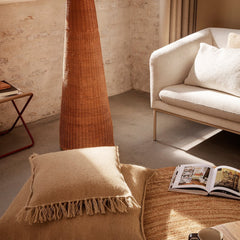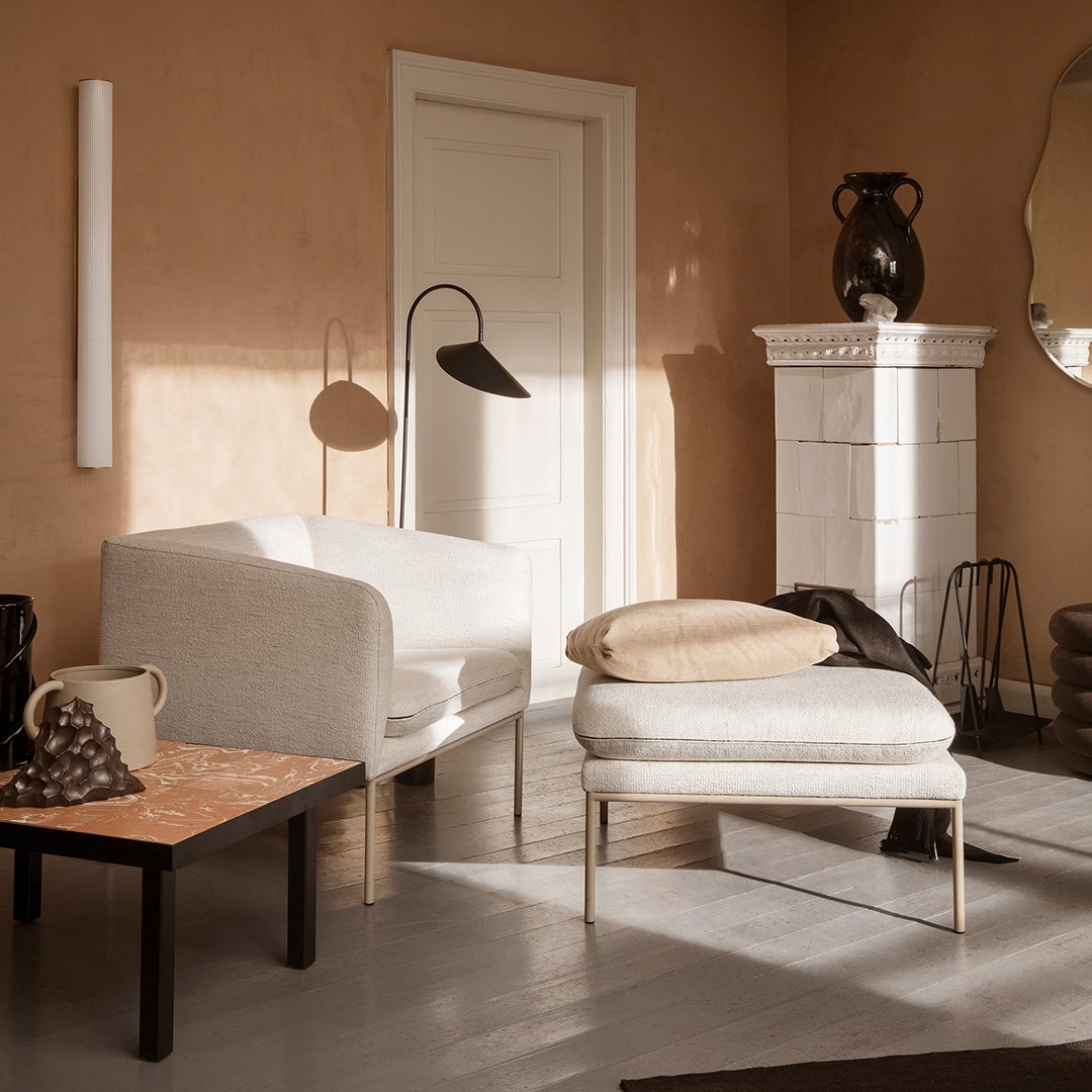 This inviting armchair has a strict sculptural outer shape that complements the curves of the inviting, rounded inner. With its tight upholstery and simple frame made from powder coated steel, the chair achieves a timeless, clean look with a feminine touch and an elevated feel thanks to its thin, delicate legs.