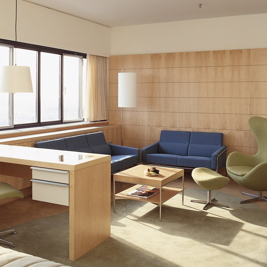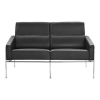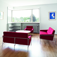 The 3300 series was created for the SAS Terminal at the Royal Hotel in Copenhagen, one of Arne Jacobsen's architectural masterpieces. In harmony with Jacobsen's architectural work at that time, the 3300 series is cool and formal. Furthermore, the 3300 series exudes Jacobsen's unfailing sense of line and proportion and his ability to design everlasting classics. Arne Jacobsen got the inspiration for the 3300 series from a sofa, which he had designed especially for his own home in the 1940s. The 3300 series forms an elegant contrast to the organic shapes of the Egg and Swan chairs, also designed especially for the Royal Hotel. The 3300 series consists of a 1-seater easy chair as well as a 2-seater and 3-seater sofa and is sublime for waiting and lounge areas as well as for private homes. The series 3300 is available in various types of leather and fabric upholstery and always with a chromed base.