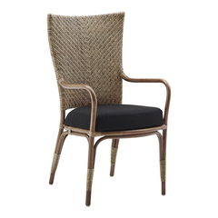 The Melody Dining Armchair features a sturdy wicker back that provides extra comfort and support while relaxing. This design is also available without armrests. Available in Cherry, Antique Brown, and Taupe Grey. Seat cushion included.