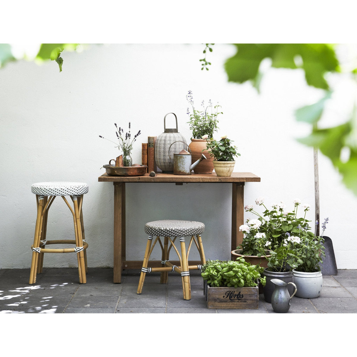 Part of the Affaire collection, the stools are for covered areas outside in summertime and for indoor use. The stools can stand a rain shower, but not daily rain. When used outdoors the rattan frame will turn greyish like teak. Do not use in heavy rain and do not leave outside all year long.