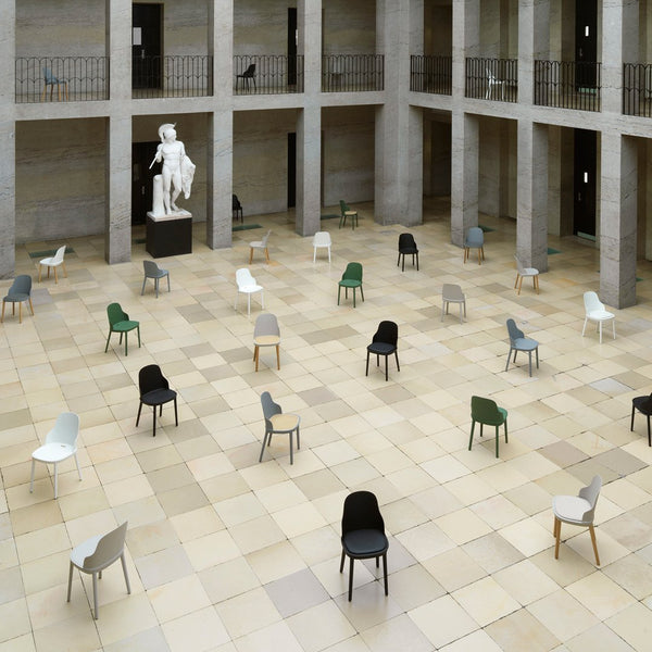 The Allez chair is a knock-down component-based chair consisting of seven main components of a frame, a seat, a backrest and four legs. The chair is suitable for indoor or outdoor use and all parts are replaceable. The Allez chair is gas-injection molded using pure polypropylene (PP) and weighs only 3.6 kg.The seat is available in polyamide (PA) with a subtle cut-out, molded wicker in PP or with upholstery for indoor or outdoor. The legs are available in PP or lacquered oak.