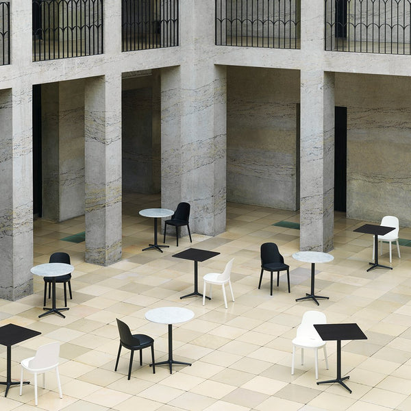 Allez table consist of a center base in cast iron with three or four legs. The tabletop comes in various sizes and shapes available in marble, Veneer, or brushed stainless steel. Allez table is suitable for indoor or outdoor use. The table is delivered flat-packed and must be assembled using the included tools. The tabletop is mounted with four screws.The marble tabletops are treated with a surface treatment that penetrates into the material and thereby provides a long-term protection. The surface should not be exposed to acidic foods or beverages, which can leave stains on the surface.