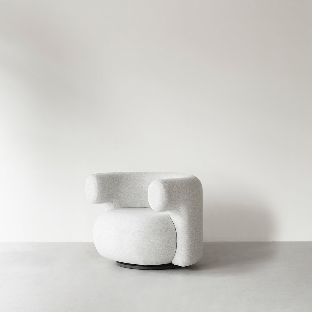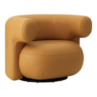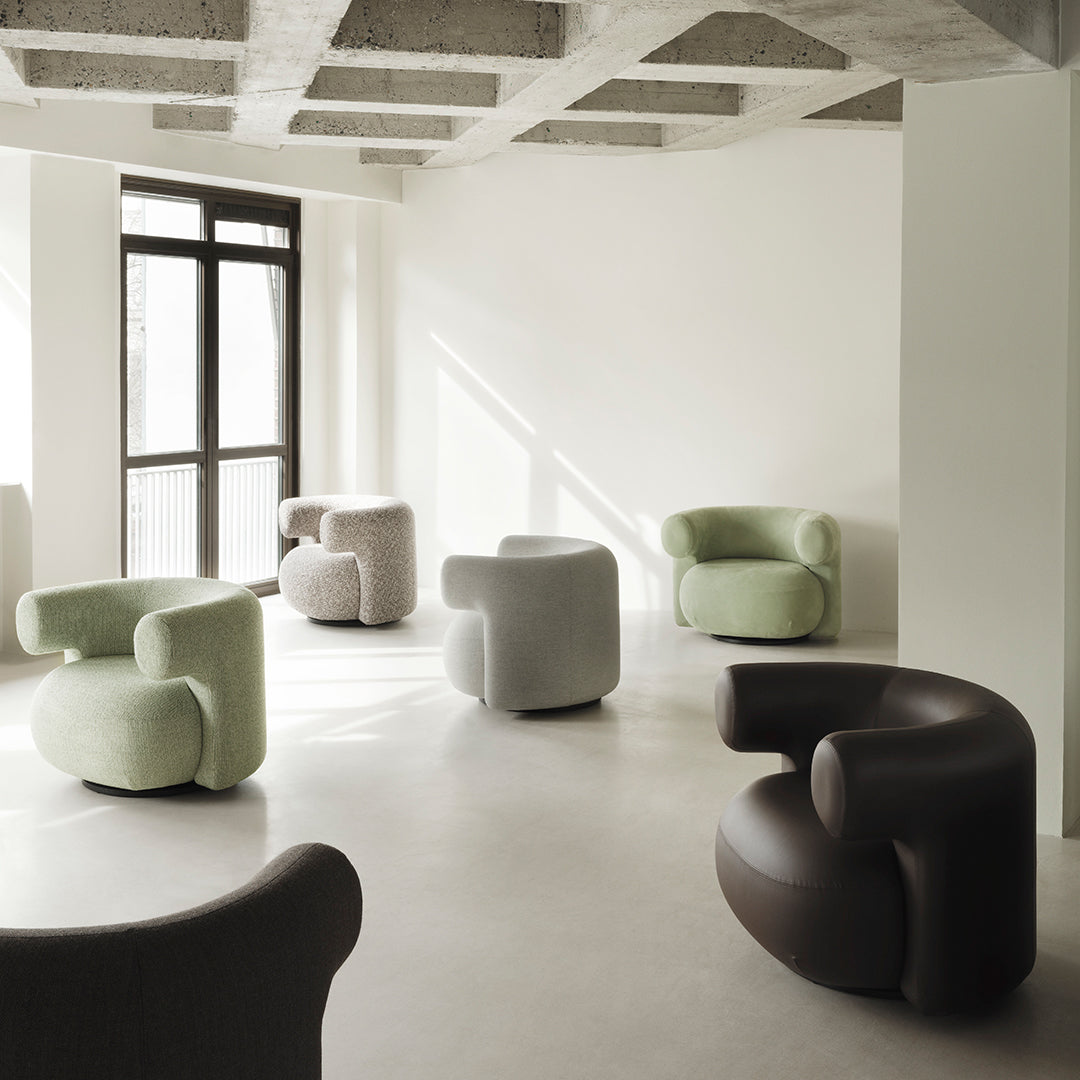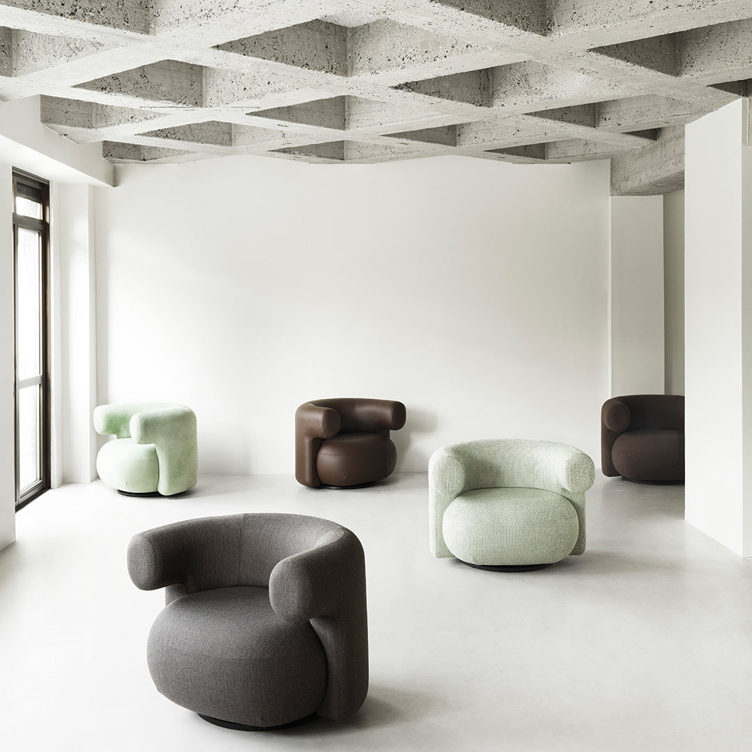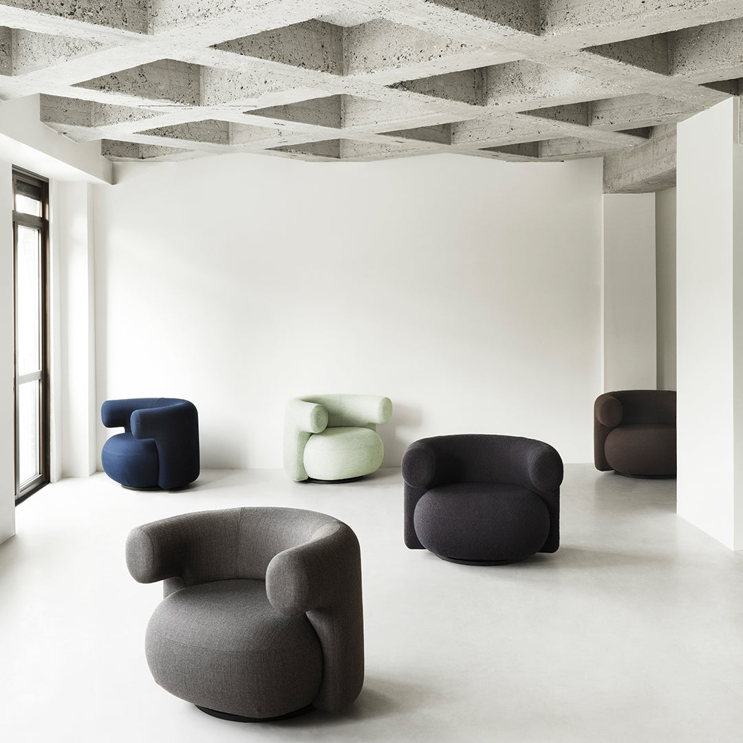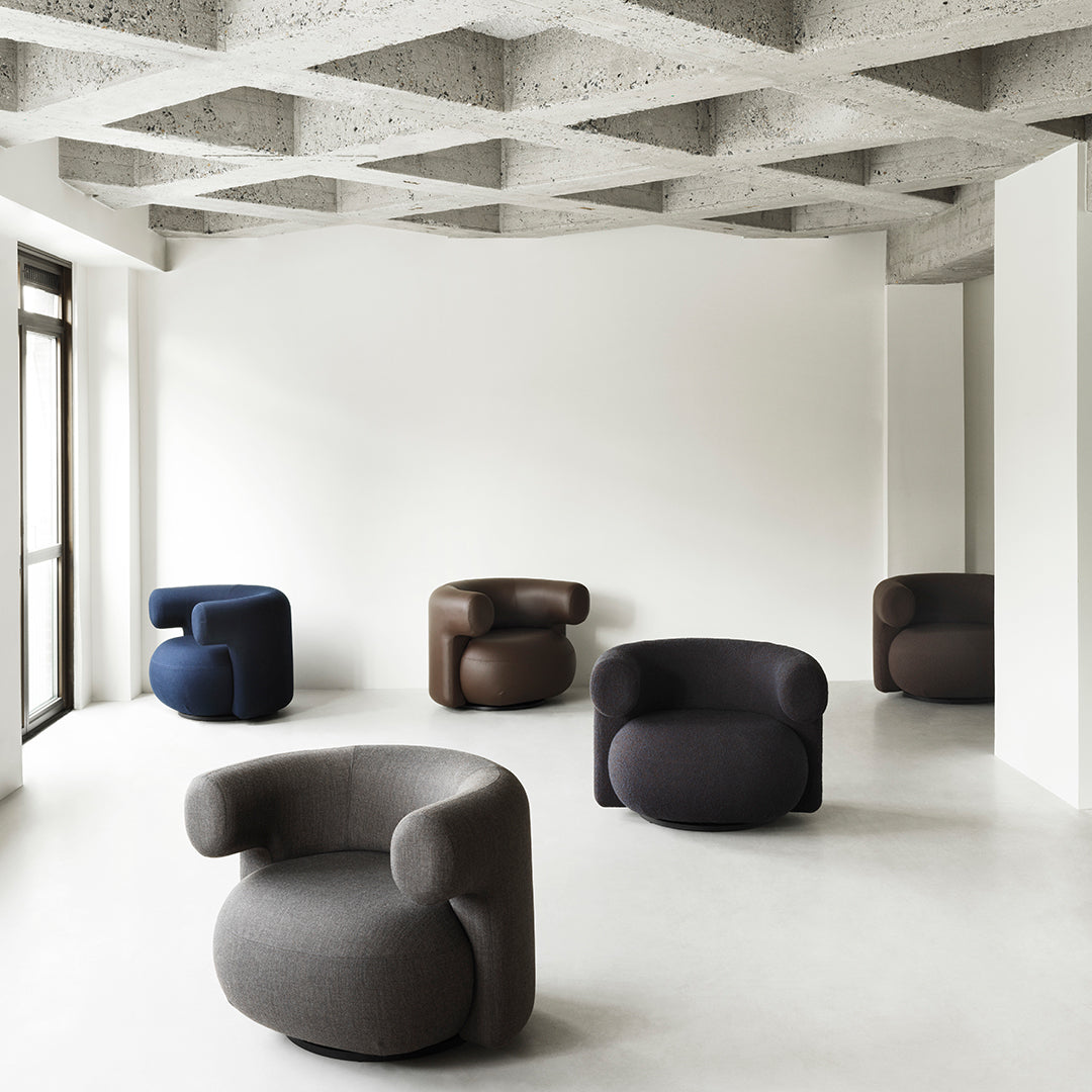Burra is a sculptural armchair with a characteristic soft expression. The rounded seat includes a swivel function with the option of an optional return swivel function for extra mobility. Burra is made for maximum comfort. Inside, a steel reinforcement structure provides stability and strength, while a combination of elastic webbing, hard molded foam and soft molded foam ensures high sitting comfort.