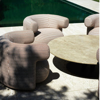 The chair maintains its plush, burrata-inspired shape, offering unparalleled comfort and visual appeal. Its base has been upgraded to waterproof painted wood, ensuring resilience against the elements. A custom protective cover is included, designed for easy use. When not in use, the cover shields the Burra Lounge Chair, protecting it and extending its lifespan.