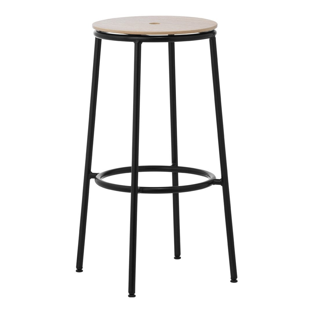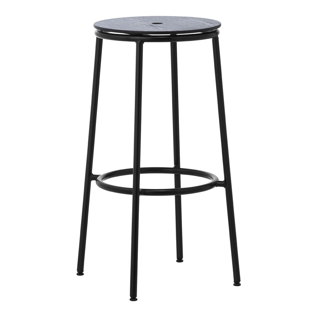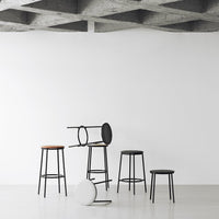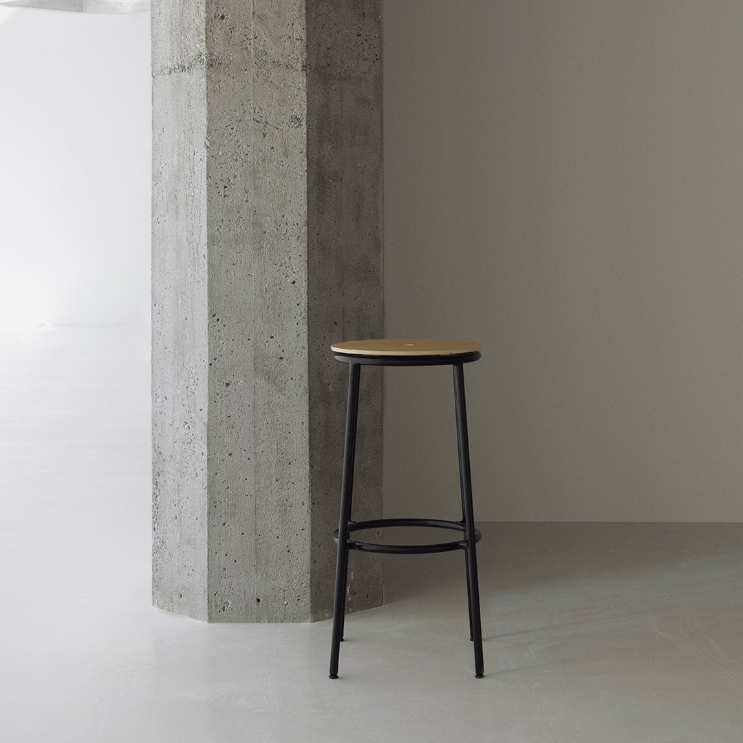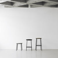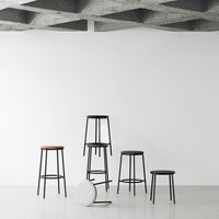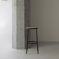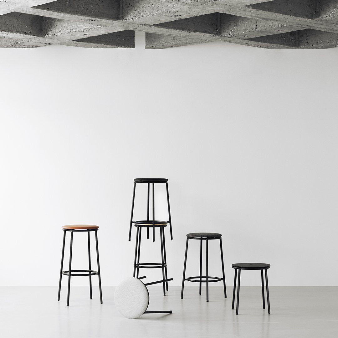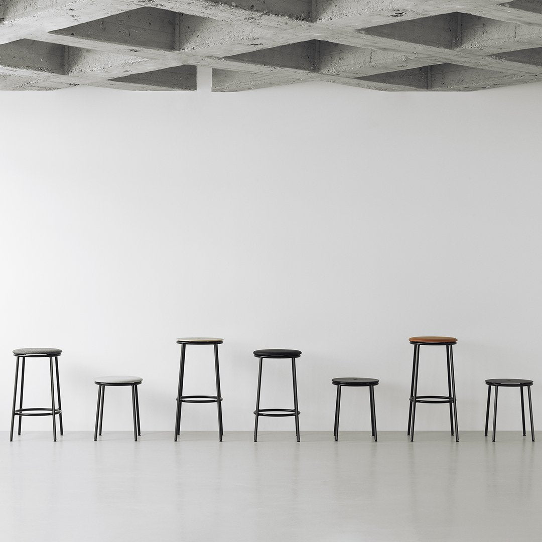 The Circa stool is a minimalistic and timeless stool comprising a steel tube frame and an oak veneer, aluminum or upholstered seat available in either textile or leather. The circular seat rests on a slender steel base in black powder steel. Available in three different sizes, Circa offers a timeless stool suitable for bars, kitchen islands, or extra seating by the dinner table.