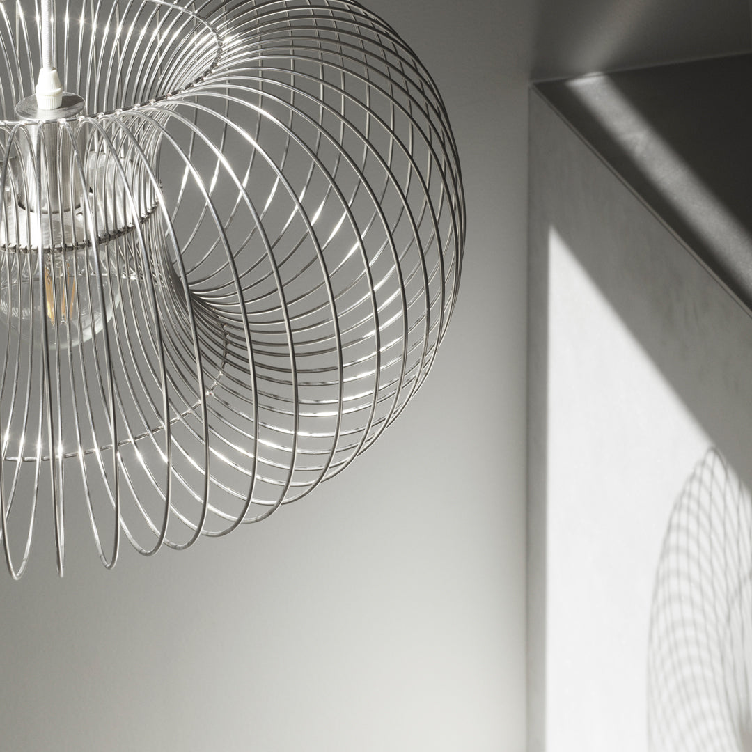 The pendant is very simple in its design but will become an aesthetic focal point in any setting. This striking lamp appears as a fountain of metal looping its existence, creating a continuous and dynamic design. A sense of infinity. The collection is available in four different sizes, making it adaptable to both smaller residences and big, spacious environments. The different sizes can also be beautifully combined to create an interesting and sculptural arrangement either in the lobby, over a long dining table, or in a high-ceilinged hallway.