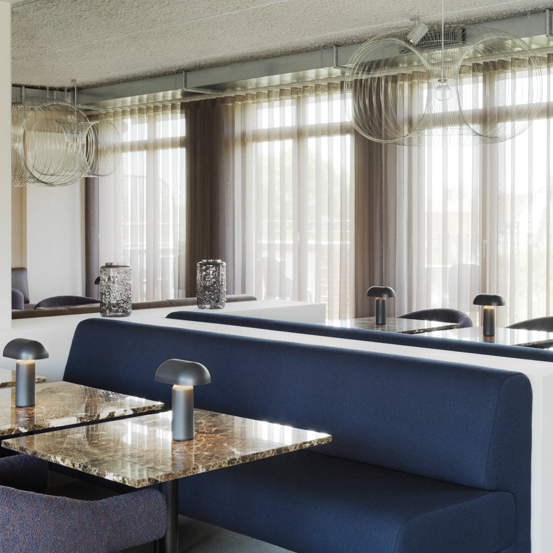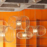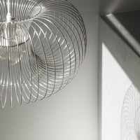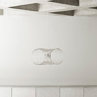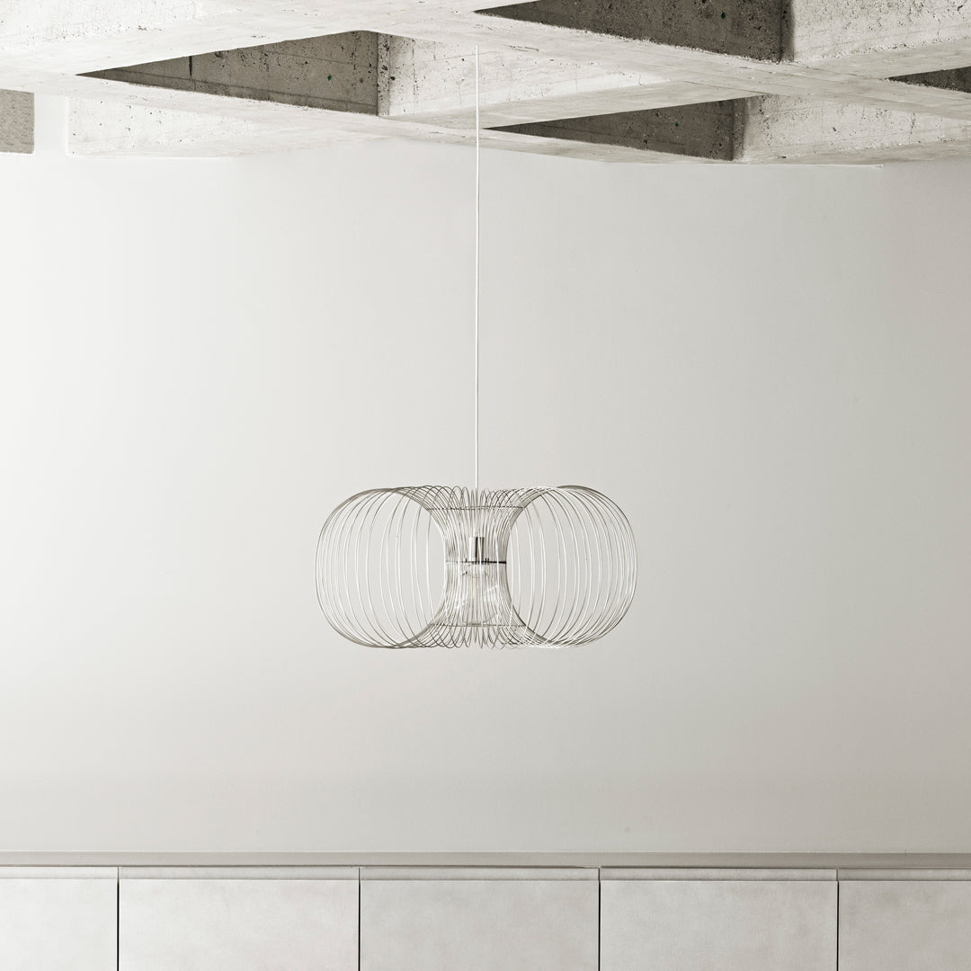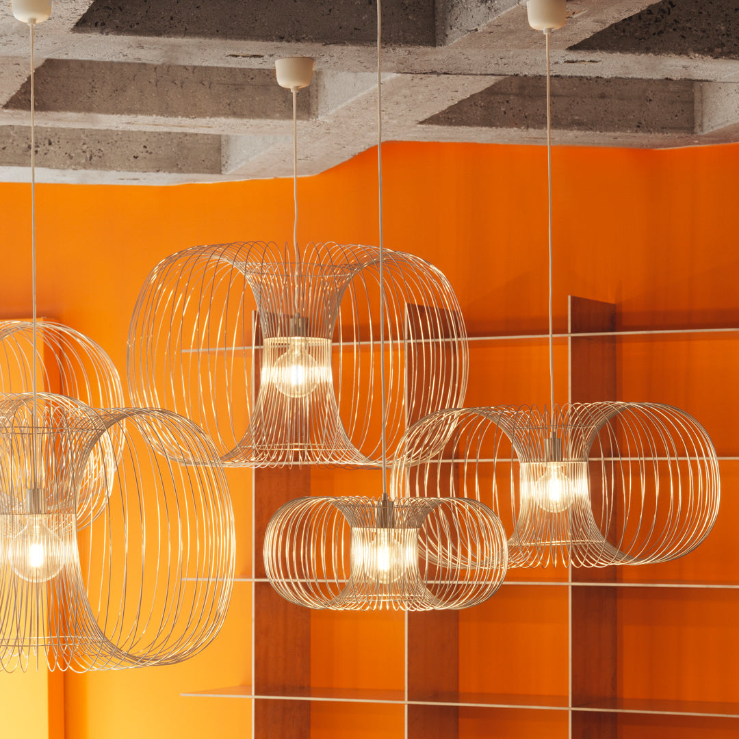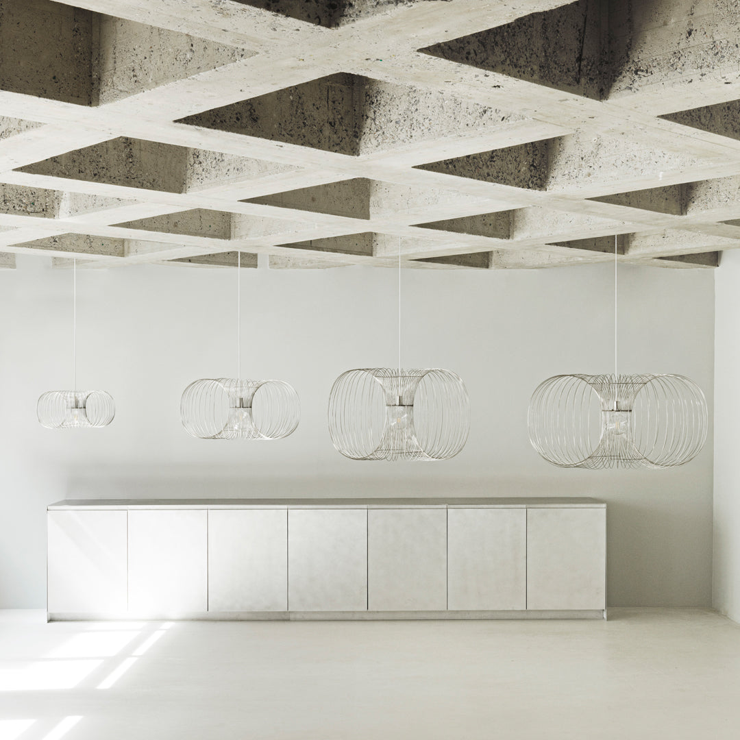 The new lamp collection Coil is designed with the wish to create as much volume as possible with as little material as possible. Coil is characterized by its rounded rectangle shape created by curved stainless-steel wires. The air between the wires makes the design appear light and airy despite its immense volume, making air as equally important for the design, as the material itself.