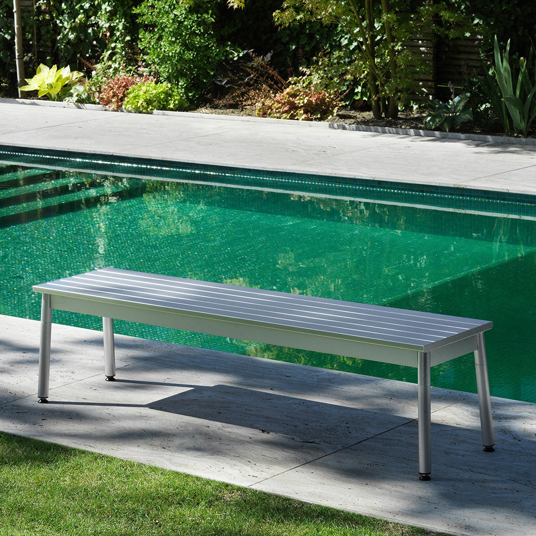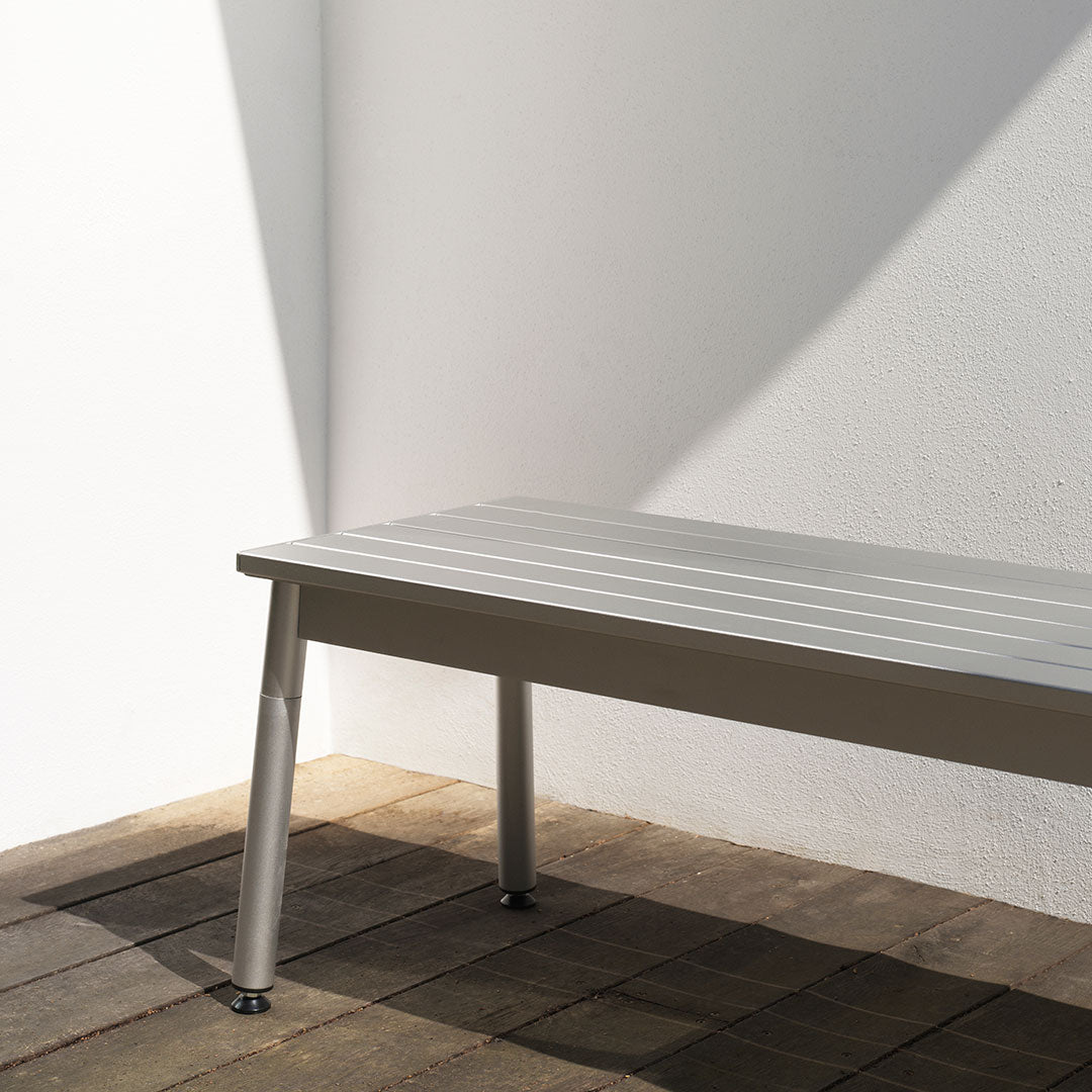 Normann Copenhagen presents Ex, the latest addition to our expanding outdoor furniture collection. Designed by Danish designer Simon Legald, Ex Table and Bench combine functionality and durability with a contemporary yet timeless silhouette, offering an outdoor design that remains relevant for years to come. With its clean lines and subtle detailing, the Ex Series allows the material, extruded aluminum, to take center stage, lending the series its name. Aluminum’s unique ability to be both lightweight and highly durable makes it the perfect choice for outdoor furniture, while its natural resistance to corrosion and decay ensures it can withstand the elements while retaining the inherent beauty of the material. The Ex Table and Bench feature a sleek construction with aluminum profiles placed with a slight gap between each, allowing rainwater to drain easily. Supported by four subtly angled legs, the design balances form and function, creating a visually light yet sturdy outdoor solution.