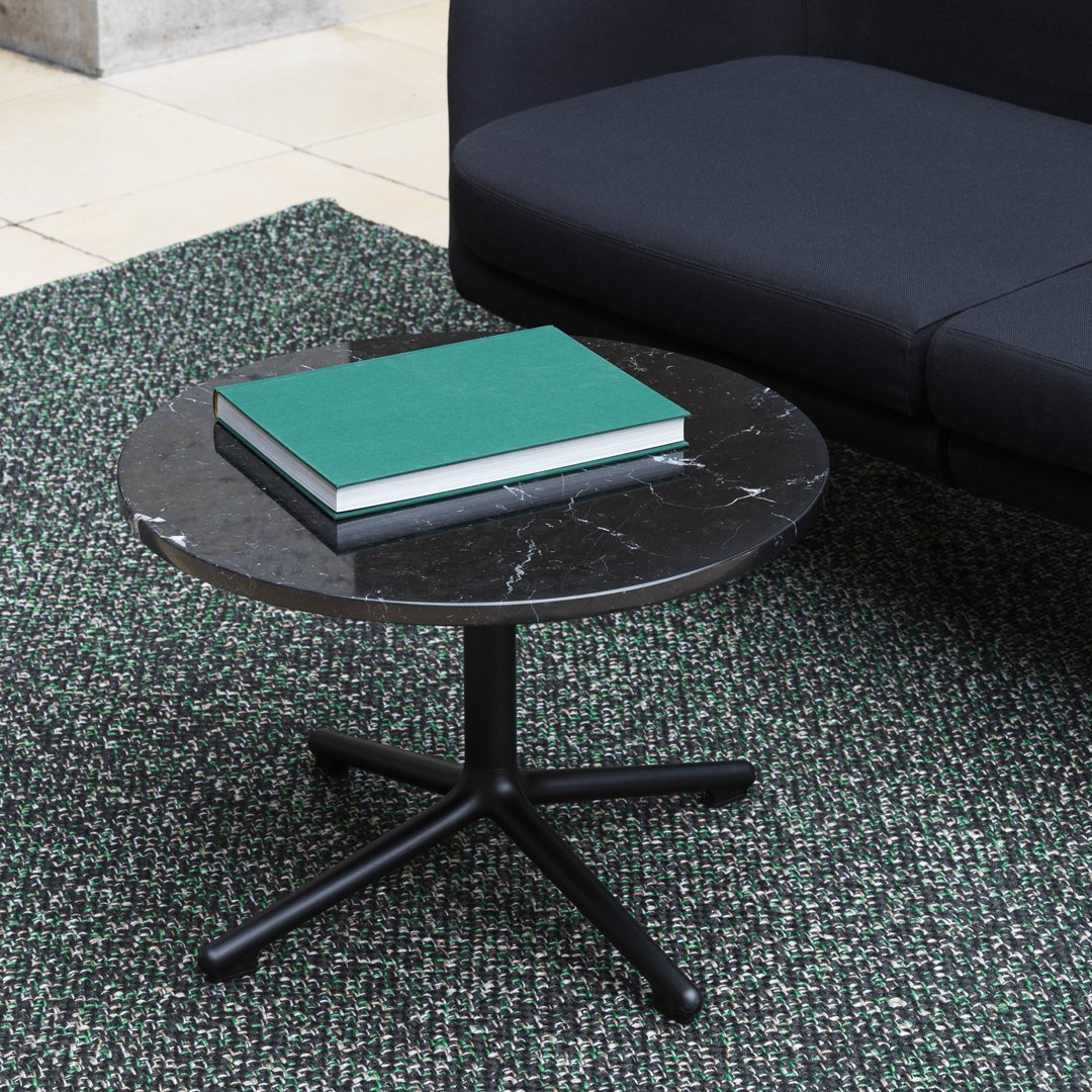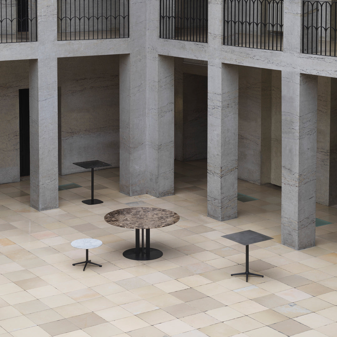 Lunar table consist of a casted aluminum center-base with four legs available in polished aluminum or powder coated black aluminum. The tabletop comes in marble or oak veneer. Lunar table is available in two heights. The marble tabletops are treated with a surface treatment that penetrates into the material and thereby provides a long-term protection. The surface should not be exposed to acidic foods or beverages, which can leave stains on the surface.