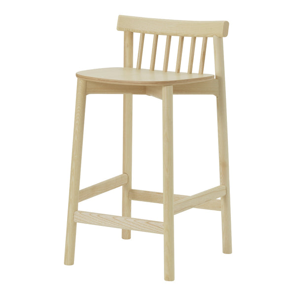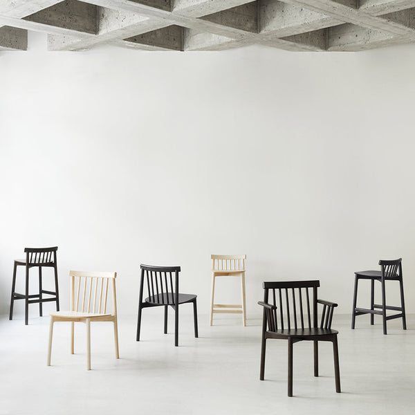 The Pind chair collection is a modern interpretation of the classic shaker chairs with slatted backs, as the name "Pind" suggests. The collection consists of a dining table chair, a dining table chair with armrests and bar stools in two different heights. All the variants are made of solid ash wood with a seat of ash veneer and are available in different colors and surface treatments.