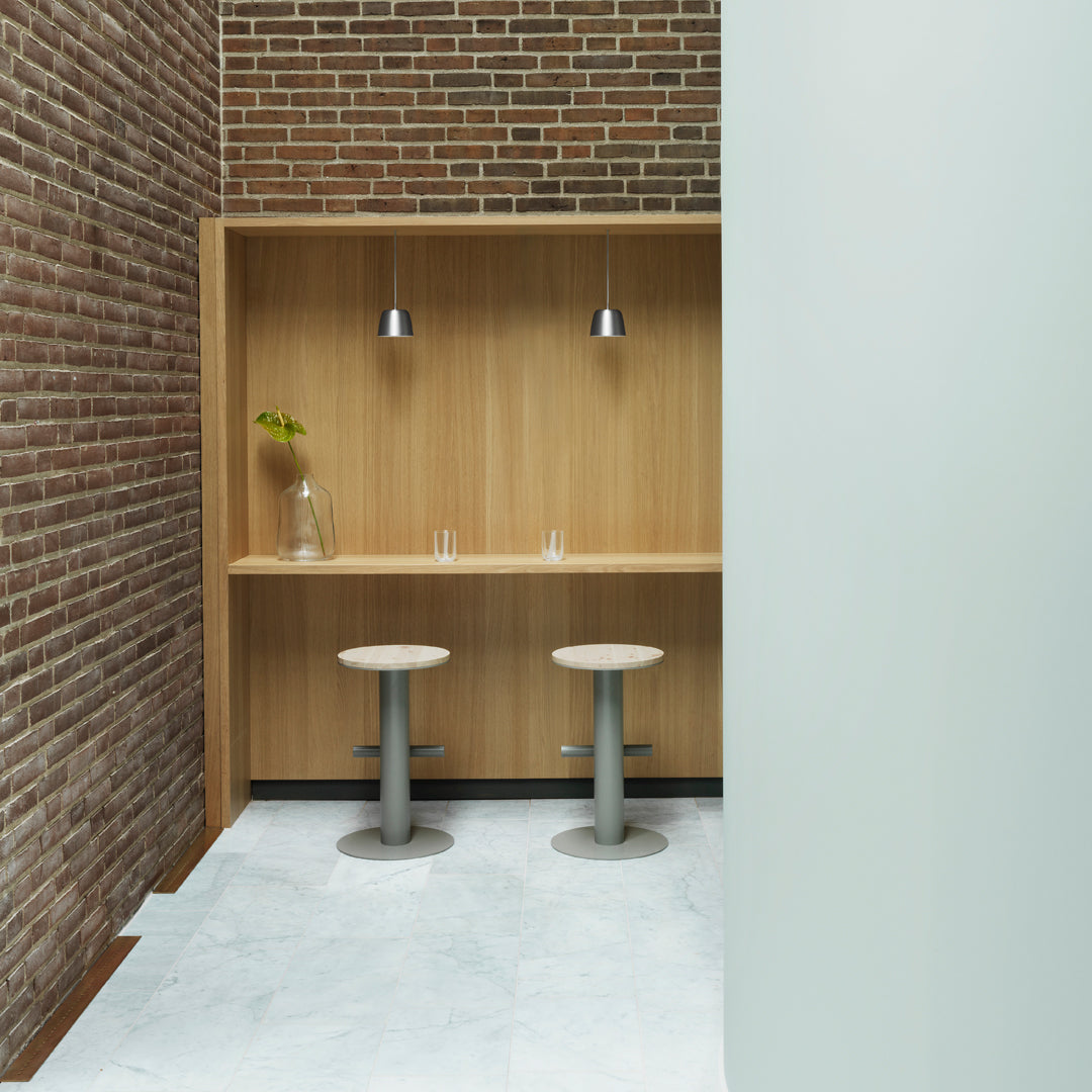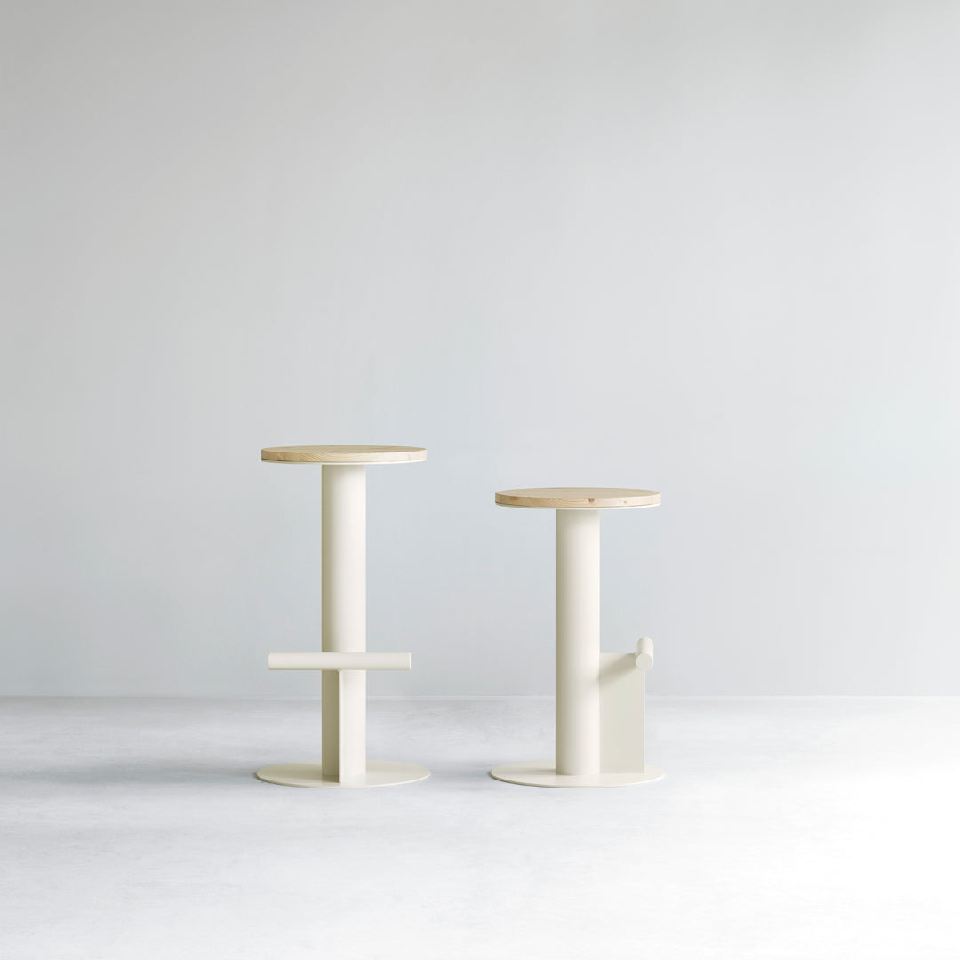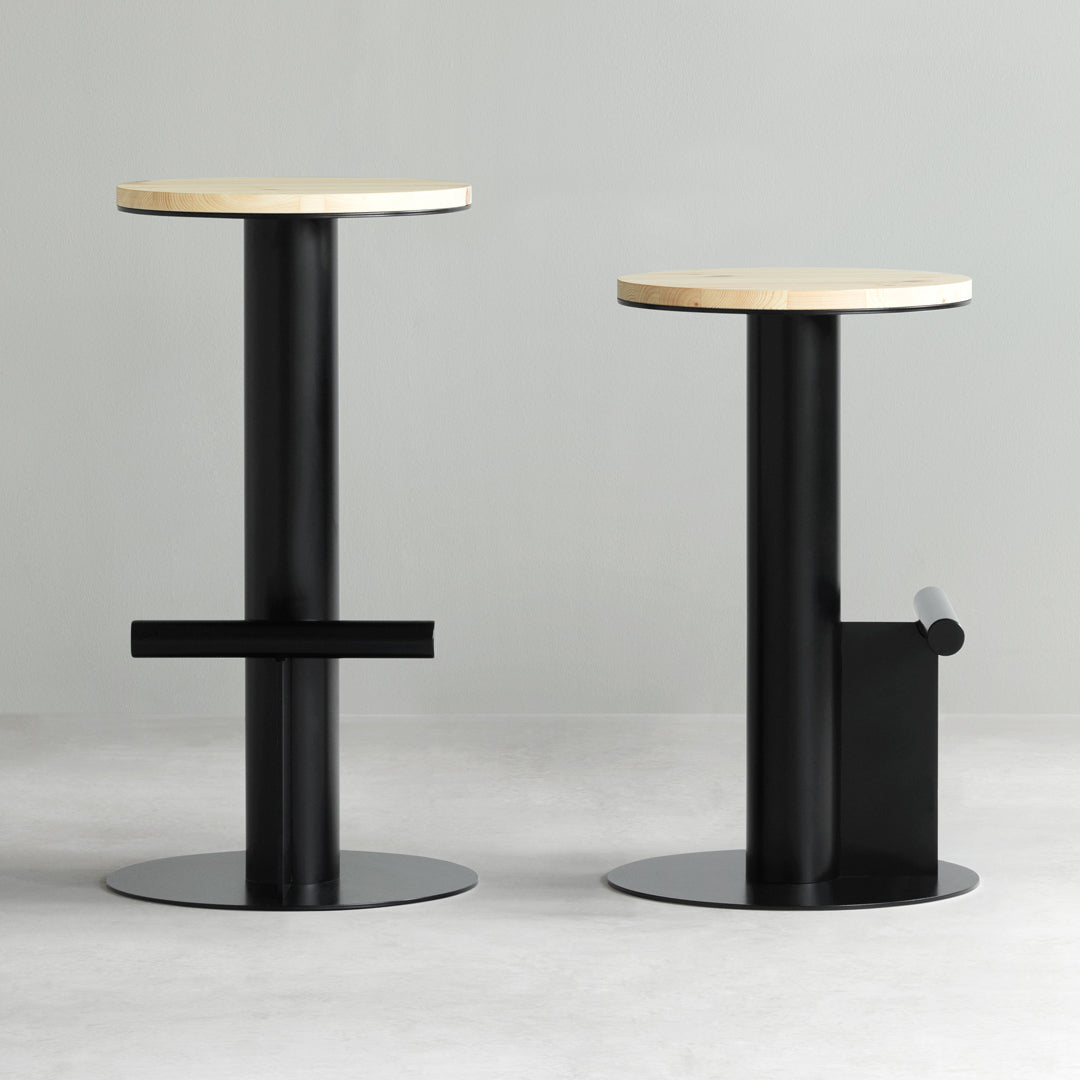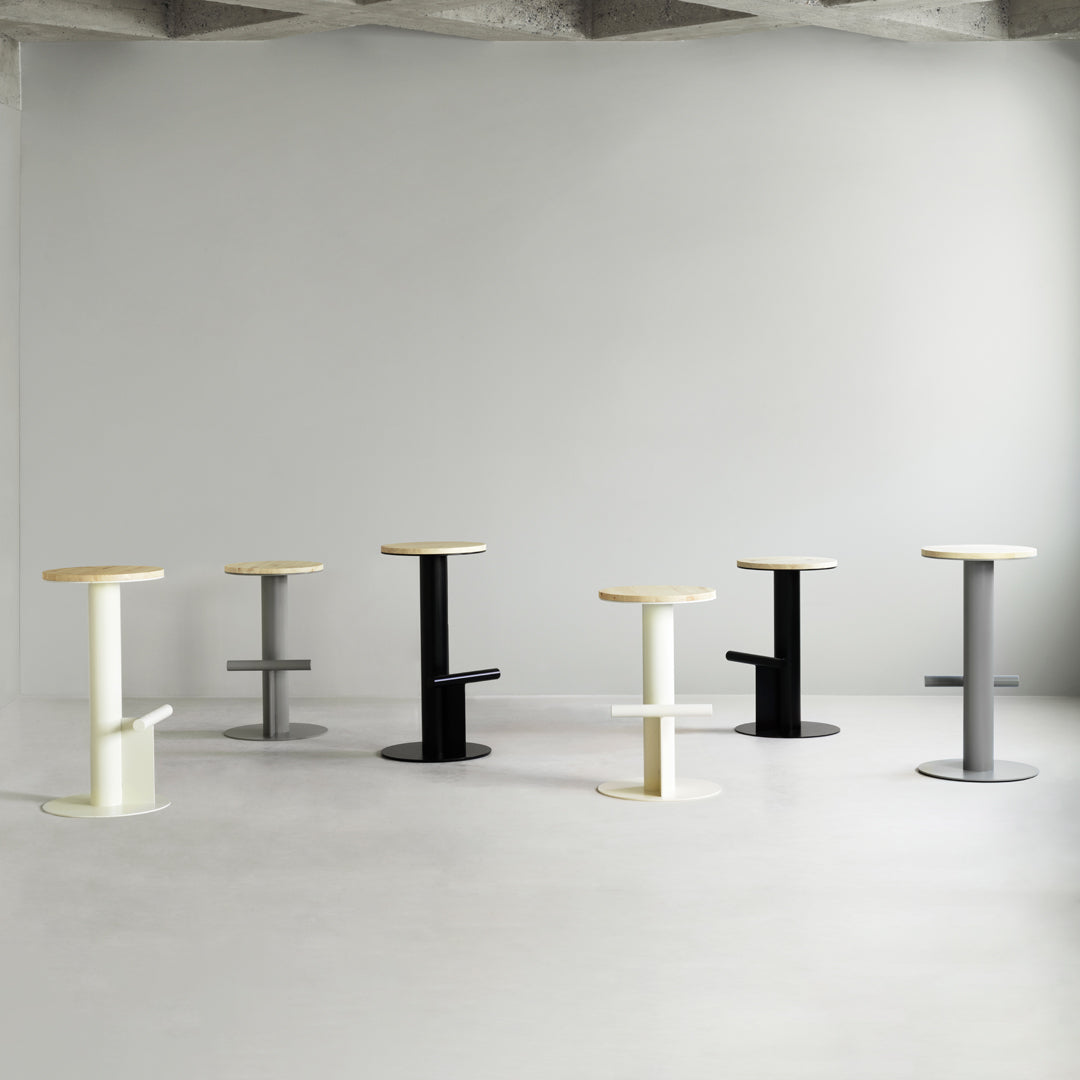 The Pole Barstool is a characterful design full of contrasting geometric elements. A powder-coated steel tube with a smaller tube as a foot piece forms the base, while a circular plate made of solid pine acts as a seat. The Pole Barstool is available in two different heights of 65 cm or 75 cm and in a number of different color combinations.