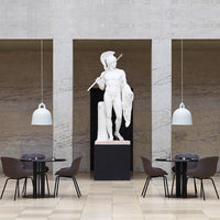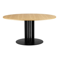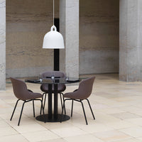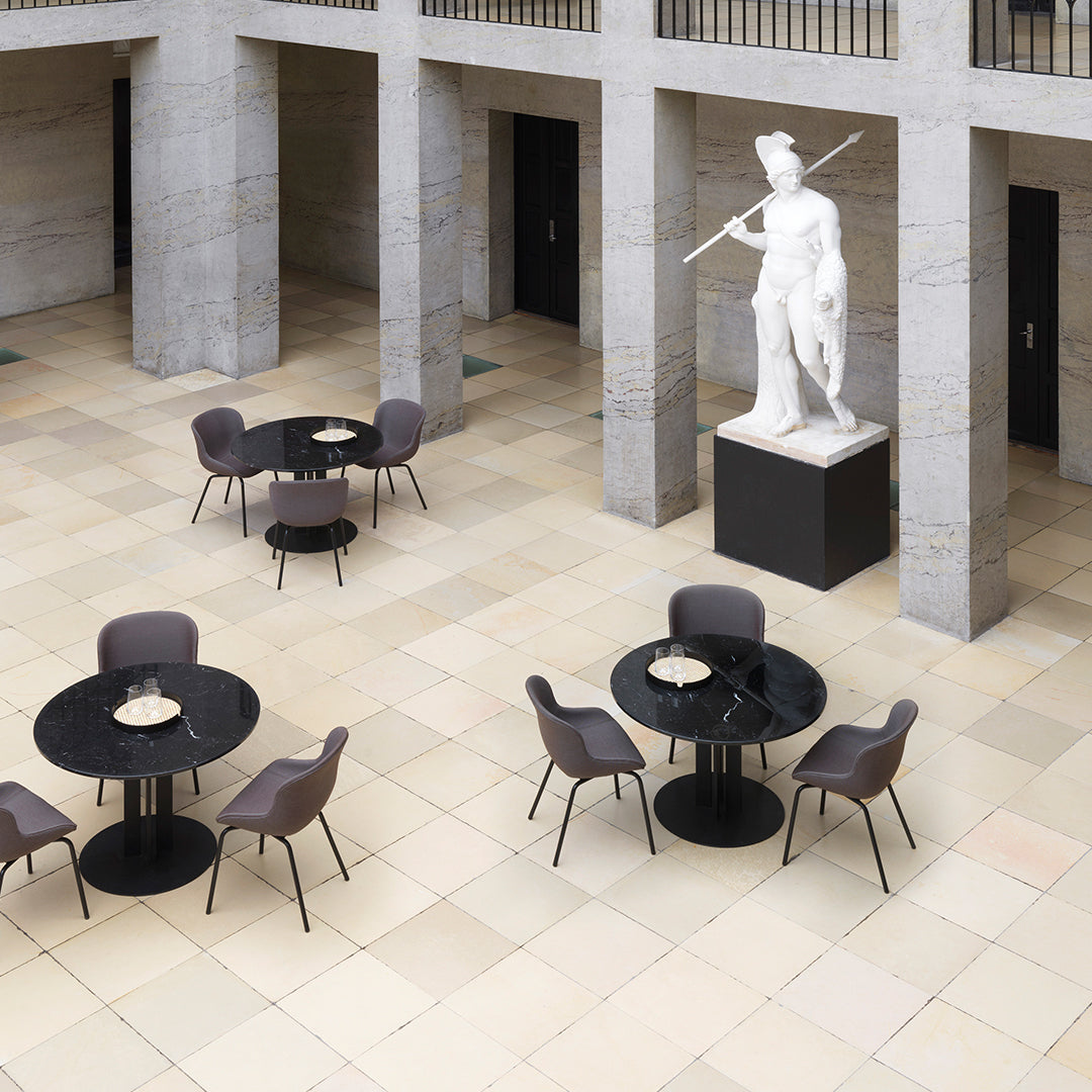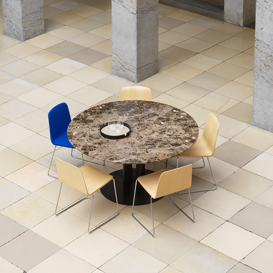 Scala table consist of a powder coated steel base with four poles. The tabletop comes in various sizes and shapes available in marble, veneer or stainless steel. The table is delivered flat-packed and must be assembled using the included tools. The tabletop is mounted with four screws.The marble tabletops are treated with a surface treatment that penetrates into the material and thereby provides a long-term protection. The surface should not be exposed to acidic foods or beverages, which can leave stains on the surface.