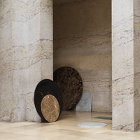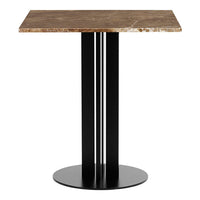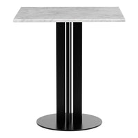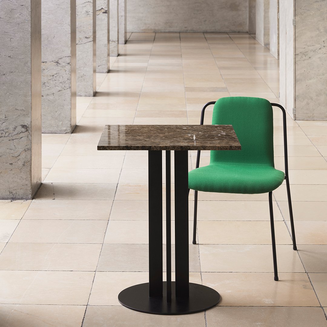 Scala table consist of a powder coated steel base with four poles. The tabletop comes in various sizes and shapes available in marble, veneer or stainless steel. The table is delivered flat-packed and must be assembled using the included tools. The tabletop is mounted with four screws.The marble tabletops are treated with a surface treatment that penetrates into the material and thereby provides a long-term protection. The surface should not be exposed to acidic foods or beverages, which can leave stains on the surface.