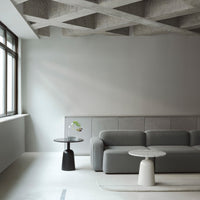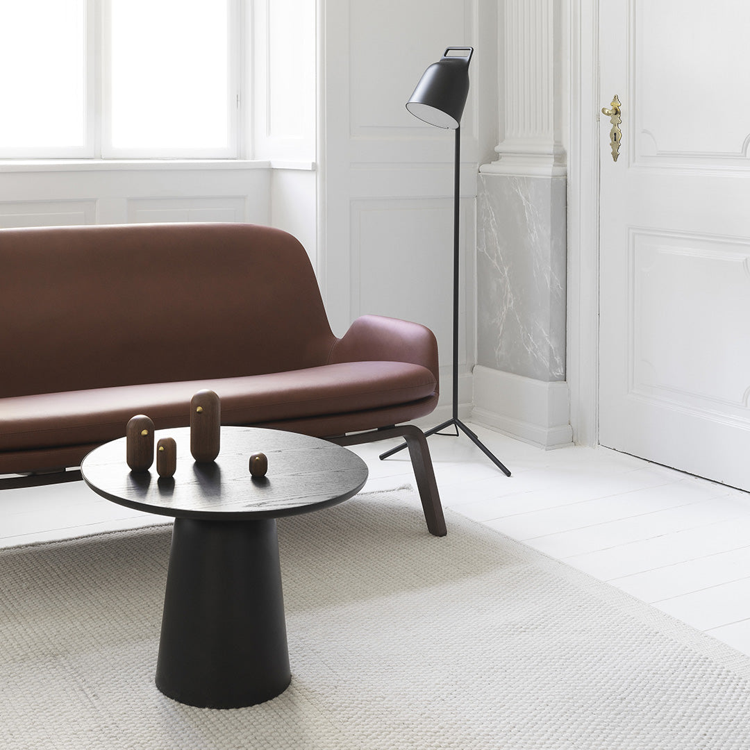Turn is well-suited for use as a coffee or side table and can be placed on its own or in a group of small tables in a living room or lounge area. The ash veneer tabletop is lacquered in the same color as the steel base. The table comes in three monochrome tones of black, dark gray and a lighter, warm gray, allowing Turn to blend in elegantly with different interior designs.