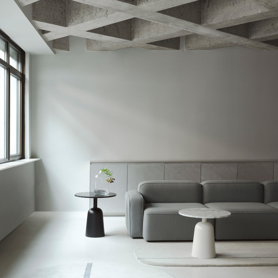 With a minimum height of 16.3" (41.5 cm) and a maximum height of 25.2" (66.5 cm), this small table can be easily adjusted to suits its existing surroundings. Beyond acting as a visual ballast to the light tabletop, the distinctive base also serves as a stabilizing center of gravity and reflects the way in which Turn has been clearly designed around its function.