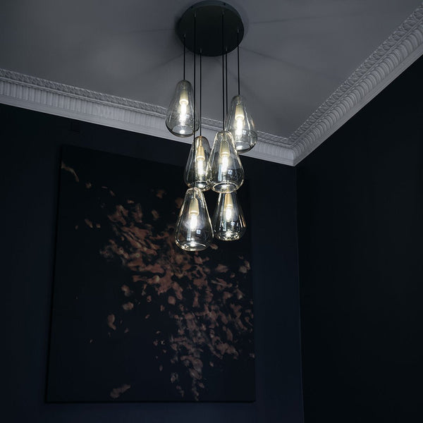 The Anoli chandeliers are created with inspiration from the Nordic nature. The Anoli 6 chandelier consists of 6 drop-shaped pendants, and the elegant mouth-blown glass shades symbolize silent raindrops on an autumn day. The natural teardrop shape creates calm and balance in the interior, and the chandelier is suitable above a round dining table or in the corner of a living room.