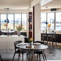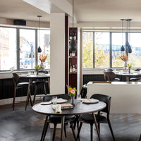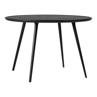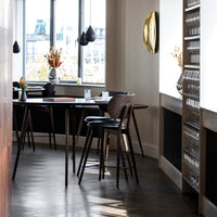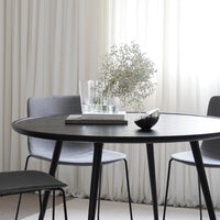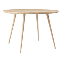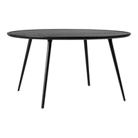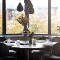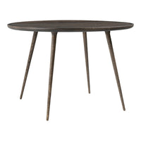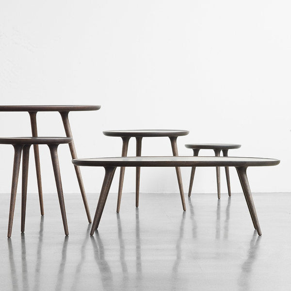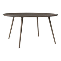 The Mater Accent Dining Table is designed by the Danish architect duo Space Copenhagen and combines a sculptural and handcrafted aesthetic. Following along the same bloodline as the highly successful 2009 Mater High Stool, the Accent collection consists of three coffee tables, a larger oval lounge table and round dining table. Crafted in solid FSC certified oak with a sirka grey stain.
