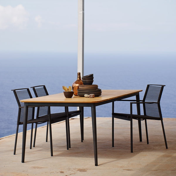 The edge series designed by Strand+Hvass offers a completely new style in the Cane-line's assortment. With it's transparent rope weaving and minimalistic aluminum frame, it will blend in many places yet stand out as a contemporary and practical outdoor furniture. Further, the comfort of the Edge series is high both in terms of sitting comfort and usability. Rope excels with a nice feel-and-touch and dries fast after a rain shower. The Edge series is produced by use of casted aluminum parts designed for optimal aesthetics and strenght. The Edge Series fits exceptionally with the Edge Extension tables and the Bench Can be used as two extra seats at the end of the table. The highback chair is the ideal Relaxing chair and used together with an On-the-Move table one has a comfortable and maintenance-free solution. The new Edge Series represents a new style that works both indoor as well outdoor settings.