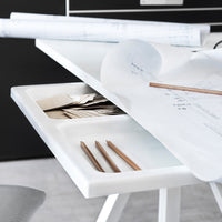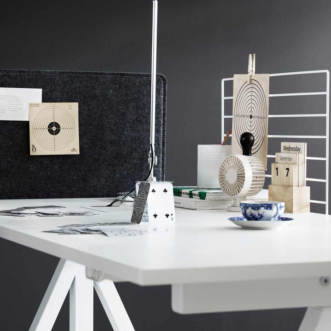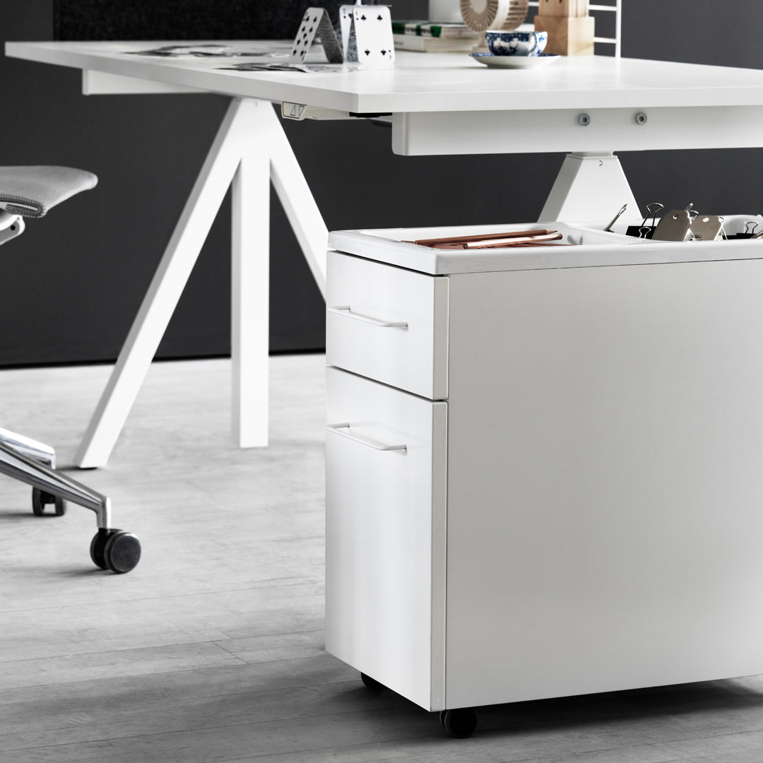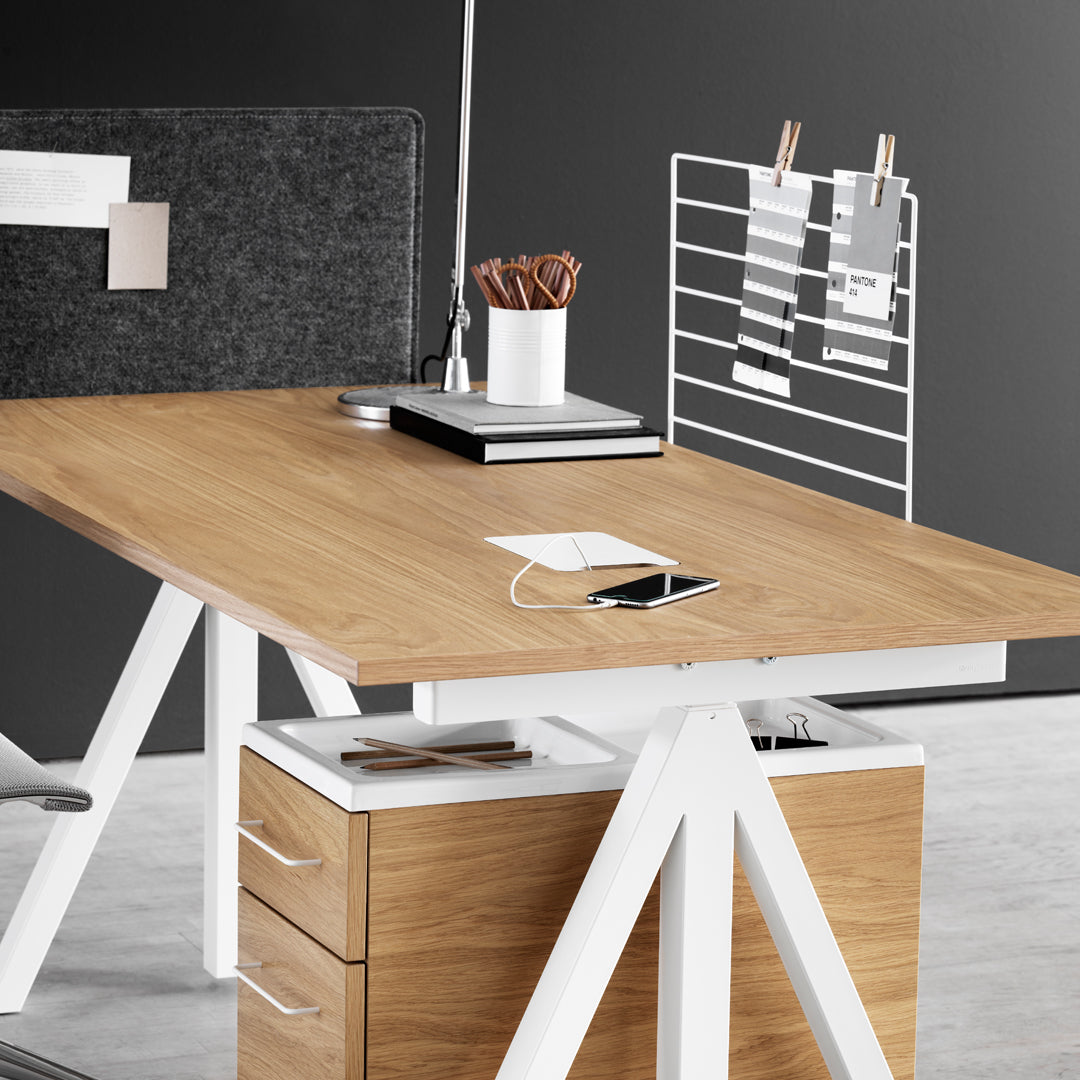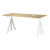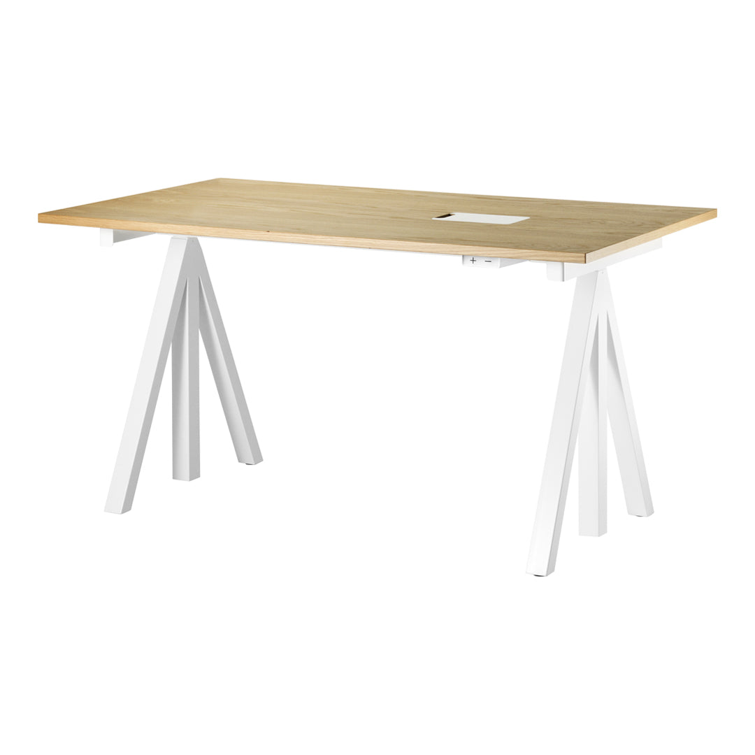 The height-adjustable work desk from Works makes it possible to create flexible and ergonomic workspaces. The work desk consists of one height-adjustable table frame and one work desk with cable cover. The work desks with 78 cm depth are available in three widths: 120, 140 and 160 cm. The work desk with 90 cm depth is intended for a meeting table or for a larger workspace and is therefore available in one width, 180 cm. The frame’s highest height is 118.5 cm and the lowest height is 71.5 cm and fits to all work desks.