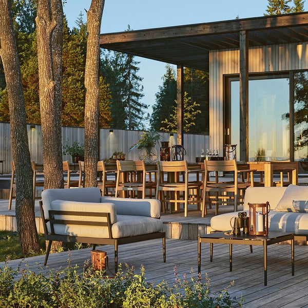A range of modular lounge furniture, made of aluminum, with cushions in Sunbrella fabric covered outdoor high quality foam filling. Or, put another way, a range that looks good and is also maintenance-free.