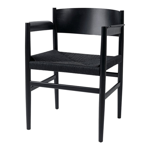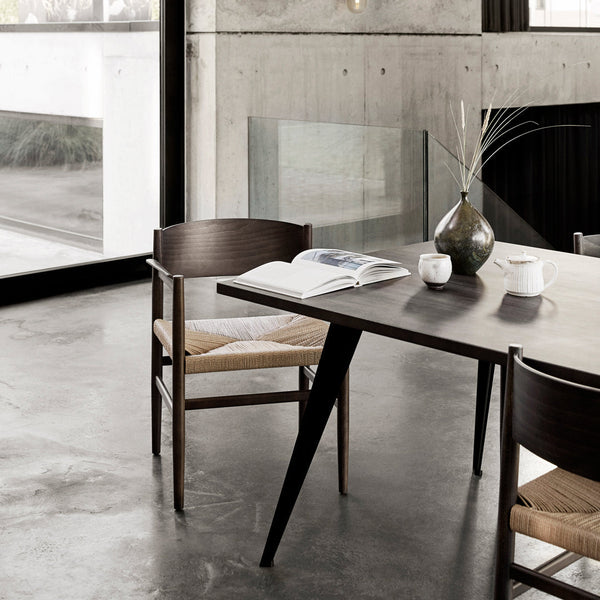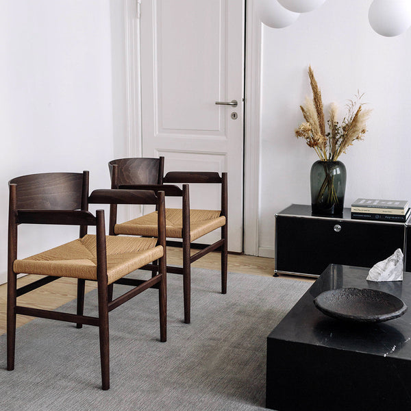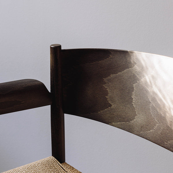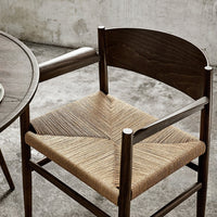 The wide armrest matches the backrest and creates a large surface to rest the arm, which increases comfort. The backrest is bent in an angle that provides a surprisingly comfortable sitting position. Nestor is available with a woven paper-cord seat or a webbed, which both is a reference to the old shaker tradition, while the resilient material makes the chair comfortable to sit in.