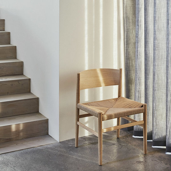 The wide armrest matches the backrest and creates a large surface to rest the arm, which increases comfort. The backrest is bent in an angle that provides a surprisingly comfortable sitting position. Nestor is available with a woven paper-cord seat or a webbed, which both is a reference to the old shaker tradition, while the resilient material makes the chair comfortable to sit in.