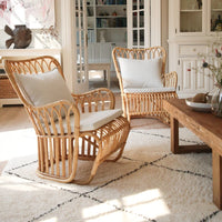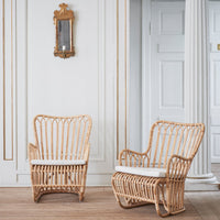 Tulip loungechair is handmade in Indonesian sustainable rattan. The chair is made in the color natural, which is original and suitable for every occasion. The fine bindings in the seat and back are made on a frame of rattan by skilled wicker workers. The chair is beautiful elegant and adds an element of nature to the living room or summer cottage. A cushion can be purchased for the back and seat in any optional fabric, sewn on our Danish sewing department. We also offer to sew cushion in your own fabric, please contact us for more information about material use. The Tulip loungechair was designed by Tove Kindt Larsen and produced by Robert W in the 1940 's. From the 1930 to the 1960 's, Tove and her husband were Edvard among Denmark's most skilled designers, covering areas such as architecture, design of the future, silverware, and textiles. They were a strong design-duo and their work were characterized by contrasts and simplicity, as well as high sense of quality and appreciation of current trends.