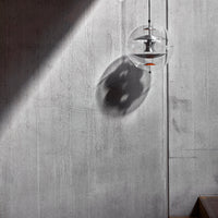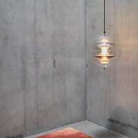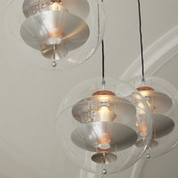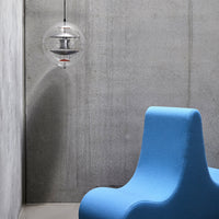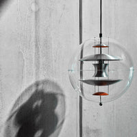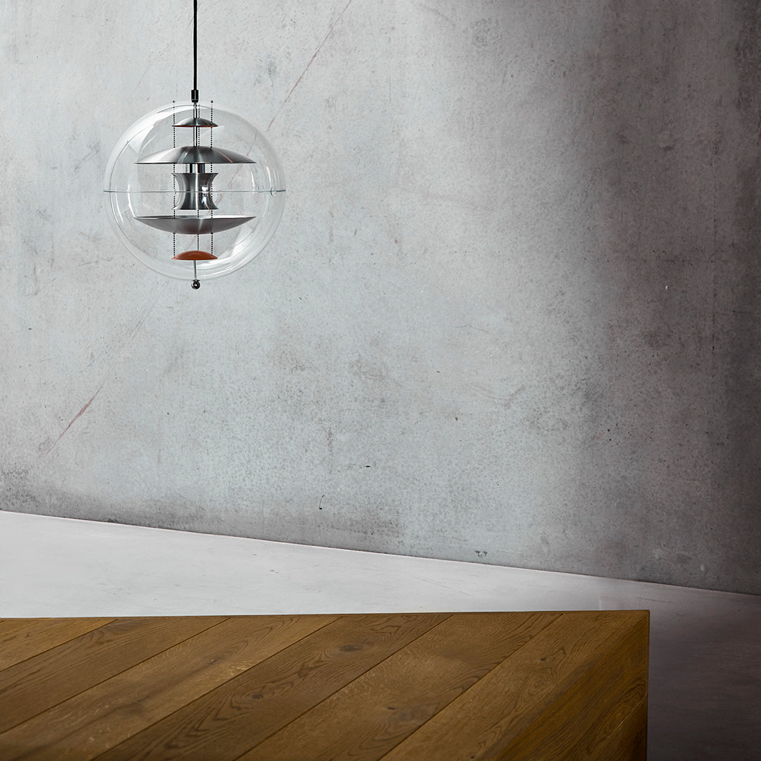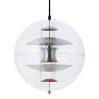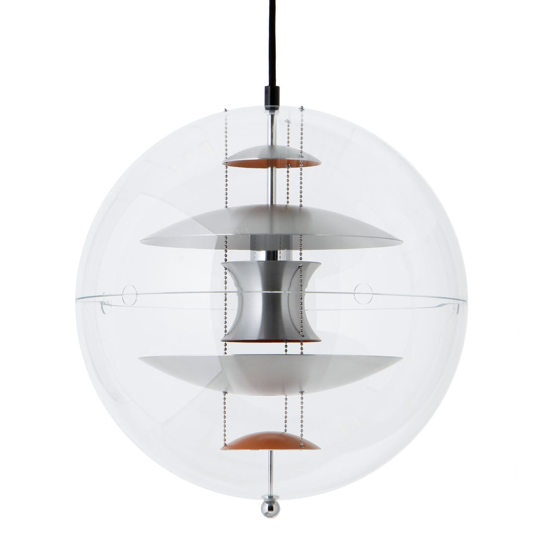 Conceived in 1969 by Verner Panton, the VP Globe is arguably the most recognized Panton lighting design. The decorative pendant features a crystal clear transparent acrylic outer-shell with five internal reflector shades suspended by delicate steel chains.