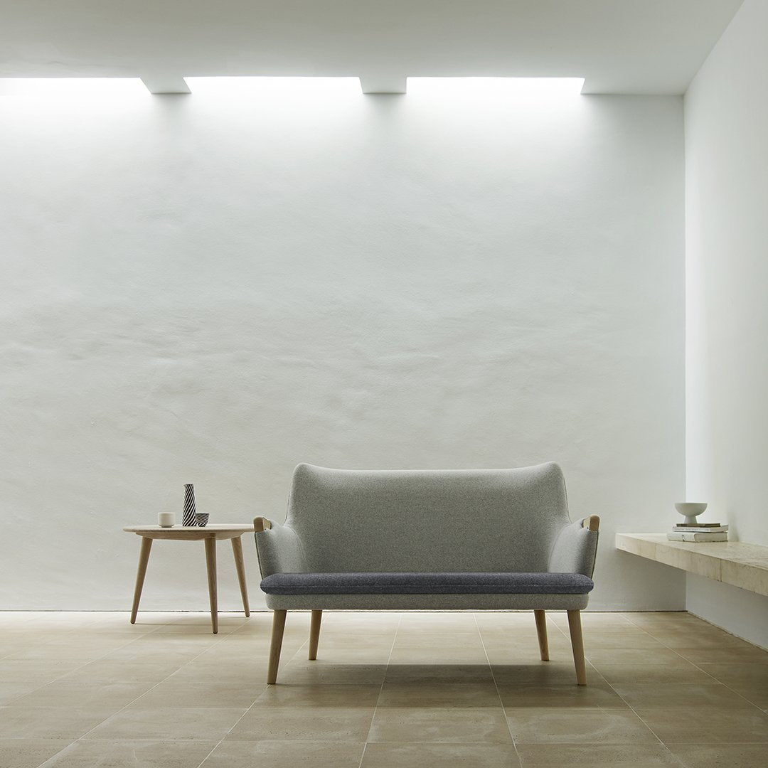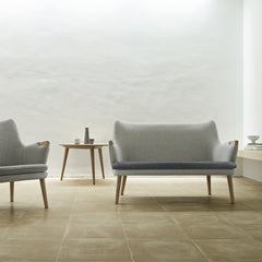 The CH72 Sofa is characterized by a slim, fully upholstered frame, loose cushions, and round, tapered legs in solid wood.