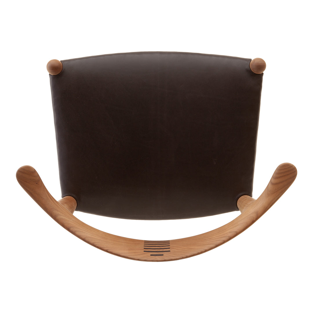 Wanting to pay homage to the breathtaking beauty of solid wood manually carved into organic shapes, Wegner decided to make a compact chair. Hence the number of pieces of solid wood used to form the armrests and back was reduced to only two pieces, joined in the middle. The joint obviously needs to be aligned with the grains of the wood with some kind of tenon and could be dowelled, but in this case Wegner decided that instead of hiding the unavoidable joint he would rather enhance it and make it a decorative feature of the design. To obtain the full visible effect, Wegner used wood of a contrasting colour.
