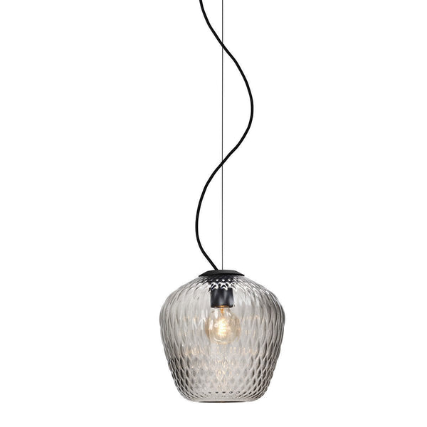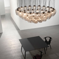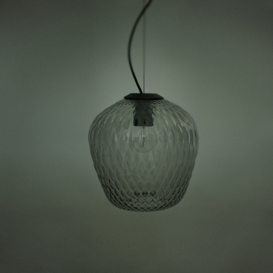 The texture of the glass was originally rendered using computer-aided design (CAD) in order to control the inflation of each bubble precisely. In production, the glass is fixed-blown into a mold and handcrafted by skilled craftsmen. The suspension system is made from powder coated cast metal and is fitted with a safety wire which holds the weight of the pendant. The wire also serves as a balancing point to ensure the pendant can always be hung level.