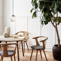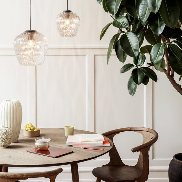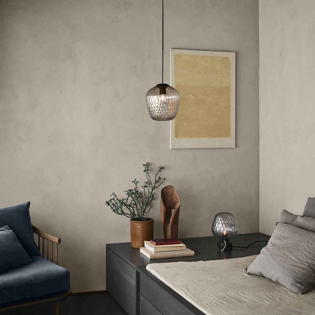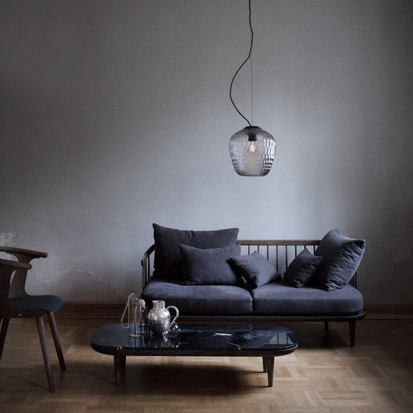 Blown is Samuel Wilkinson's first lamp for &tradition. A mouth-blown pendant with a quilted pattern, it comes in two versions: a translucent variant with a silver luster and an opal one. The pendant is fitted with a powder-coated cast metal suspension. The pendant was conceived as an exploration of the reflections, distortions, and refractions of a light source when surrounded by patterned glass. Wilkinson explains the wide range of inspirations he looked to when developing Blown: "Like with any project, you start with an idea, and then you start looking at the world through a sort of filter. I've looked at antique ceramics, old glass pieces, lenses from very old lamps, lighthouses, even a mirrored bottle, just to see the way the light comes off it." Wilkinson even sought inspiration in seeds and berries - particularly raspberries - for the quilted texture of the glass. Blown makes a statement as a standalone item, but works equally as well in clusters or in succession. The two versions cater to a range of interiors, with the sandblasted variant providing a subtle, sophisticated glow, while the translucent version transforms the space it inhabits with the intricate textures and patterning.