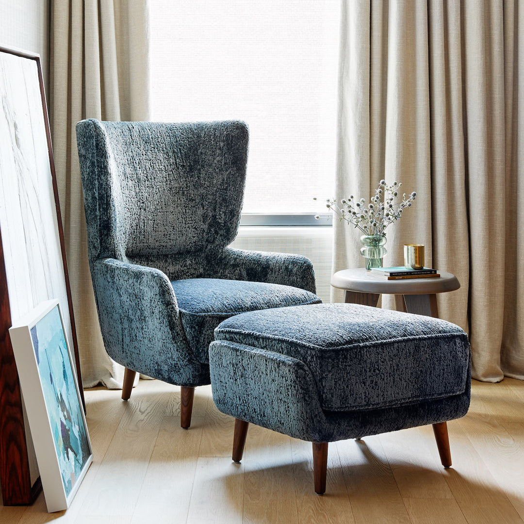 Built as a companion for the Teddy or Fold Lounge Chair, continuous vectors define its planes, which balances a traditional vernacular with a contemporary silhouette. Whether under your feet, or set in front of the fireplace, the Teddy Ottoman is still designed to stand on its own. Available in a range of finishes, COM/COL, and customizable upon request.